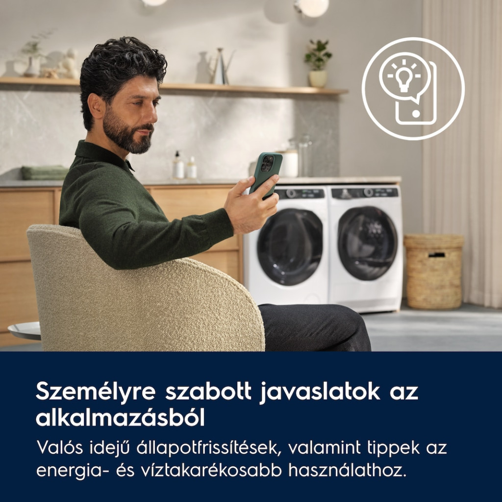 A SteamCare mosógép gyorsan felfrissíti akár a kényes ruhákat is, amelyeket nem kell feltétlenül kimosni. A gőz csökkenti a gyűrődéseket és eltávolítja a szagokat. A 25 perces SteamRefresh program ideális a finom holmik felfrissítéséhez. Ráadásul kevesebb vizet használ, mint egy hagyományos mosóprogram. A 69 perces QuickCare egy gyors, hatékony, 30°C-os program pamut és szintetikus ruhákból álló vegyes töltetek mosásához. Párosítsa készülékét az Electrolux alkalmazással, hogy azon keresztül is irányíthassa. Emellett látni fogja a valós idejű állapotfrissítéseket, valamint tippeket kap mosási szokásai alapján az energia- és víztakarékosabb használathoz. A Care dobban a ruhák simán csúsznak a dob felszínéből kiemelkedő párnaszerű mintázaton és az újratervezett átemelőkön. A dob különleges mintázatának köszönhetően még kíméletesebb a ruhák mosása.